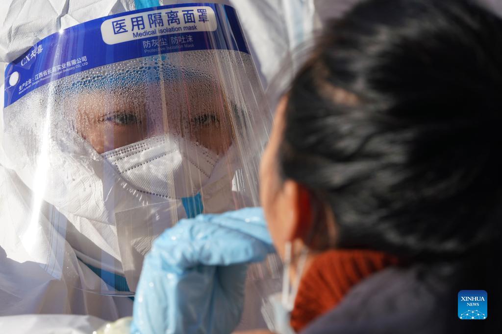 A medical worker takes a swab sample from a resident for nucleic acid testing in Heihe, northeast China's Heilongjiang Province, Oct. 31, 2021. As of 12:00 p.m. Saturday, Heihe in Northeast China's Heilongjiang Province reported 54 locally transmitted confirmed COVID-19 cases, according to local health authorities. Authorities in Heihe have started massive nucleic acid testing to contain the spread of infections, and taken measures to ensure the supply of daily necessities for residents. (Xinhua/Wang Song)