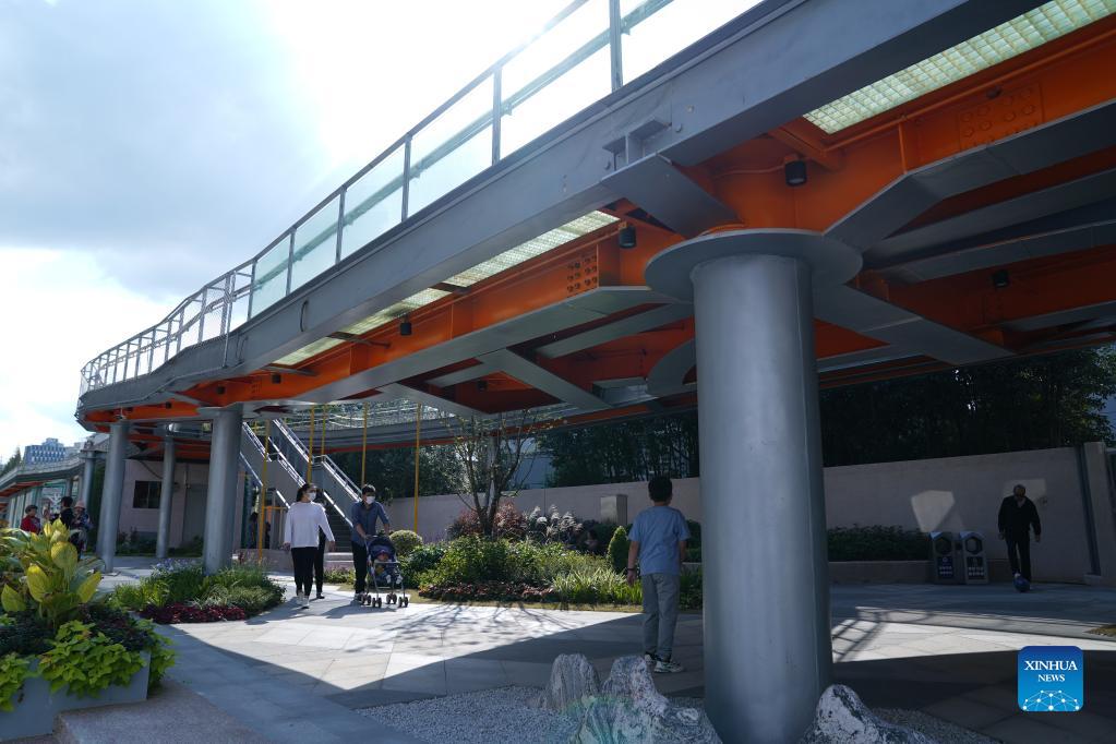 Photo taken on Oct. 31, 2021 shows a view of the Baixi Park in Putuo District of Shanghai, east China. Transformed from a market built on an old railway branch line, the Baixi Park is now a city park which provides citizens with space for exercise and entertainment. (Xinhua/Ding Ting)