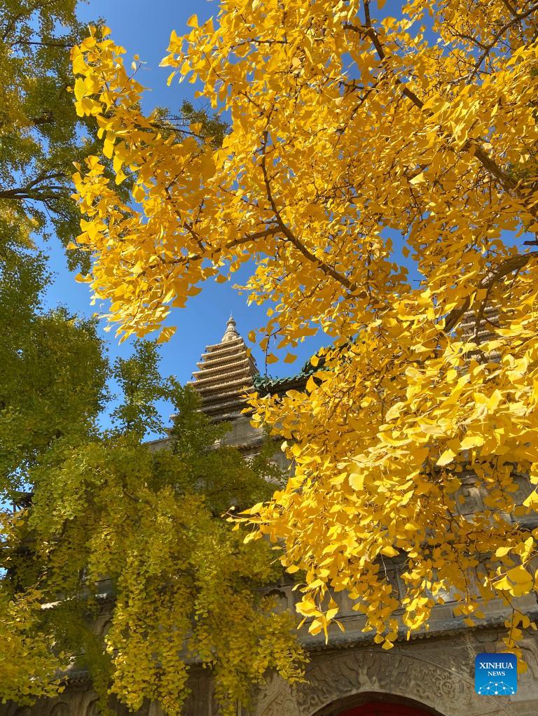 Photo taken with a cellphone on Oct. 31, 2021 shows the autumn scenery in Wuta (five-pagoda) Temple in Beijing, capital of China. (Xinhua/Wang Qingqin)