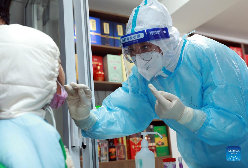 A medical worker takes a swab sample from a resident for nucleic acid test in Shenze County of Shijiazhuang, north China's Hebei Province, Oct. 31, 2021. One locally transmitted COVID-19 case and one asymptomatic case have been registered in Shenze on Sunday. (Photo by Zhai Haijing/Xinhua)
