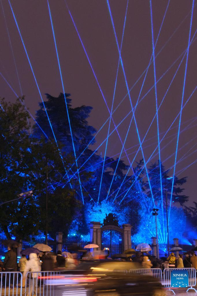 People watch a light show in downtown Madrid, Spain on Oct. 30, 2021. Light shows were staged in Madrid on Oct. 29-31, with artists from Spain, France, Finland and other countries and regions projecting their creative ideas on facades of more than 20 buildings in the city. (Xinhua/Meng Dingbo)