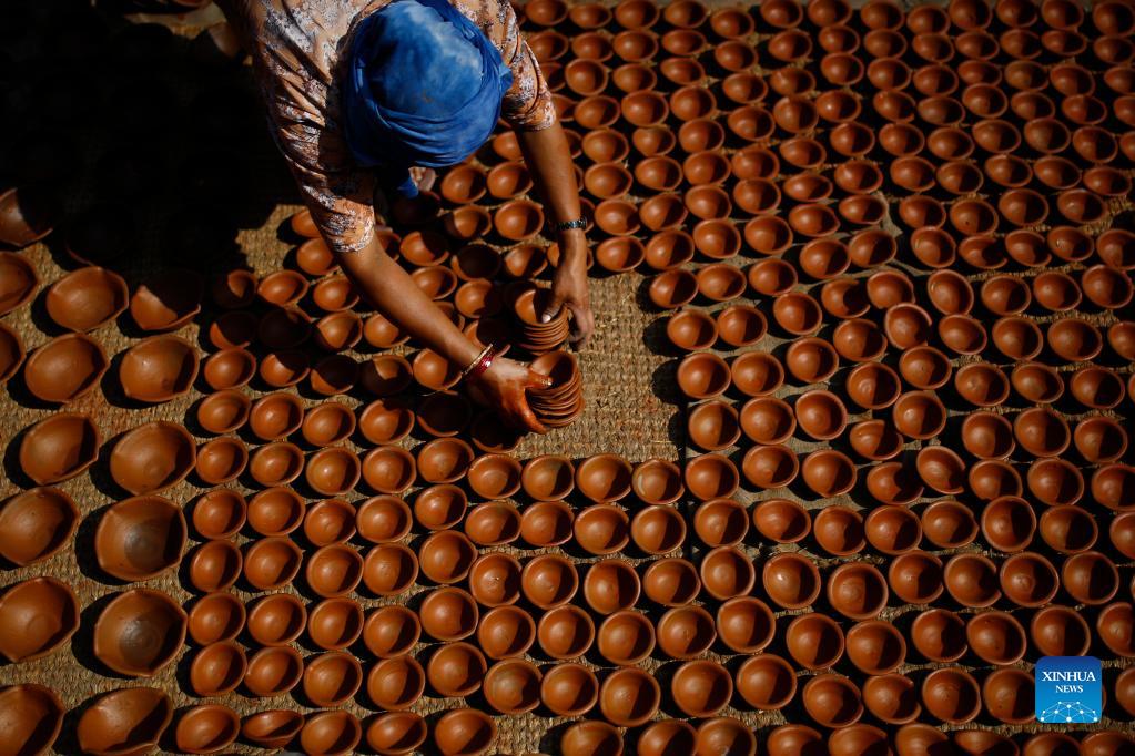 A Nepalese woman prepares clay pots for "Tihar", a Hindu festival, at Pottery Square in Bhaktapur, Nepal on Oct. 31, 2021. (Xinhua/Sulav Shrestha)