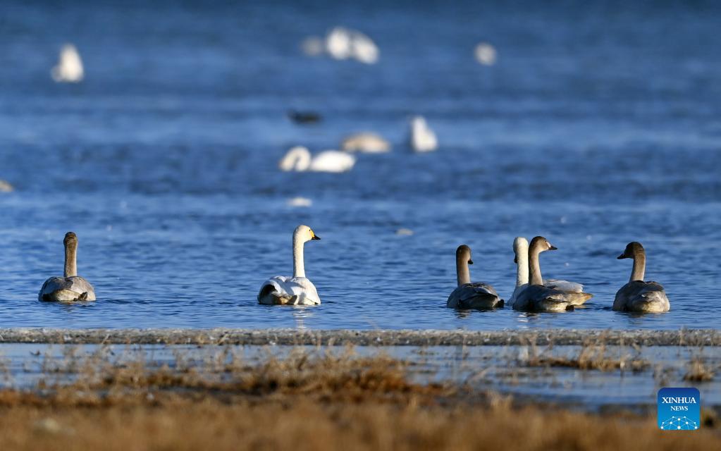 Swans are seen at the Hekou Reservoir wetland in Yulin, northwest China's Shaanxi Province, Oct. 31, 2021. To the south of the Maowusu Desert, the Yuyang District has witnessed improvement in eco-environment thanks to decades of afforestation efforts. (Xinhua/Tao Ming)