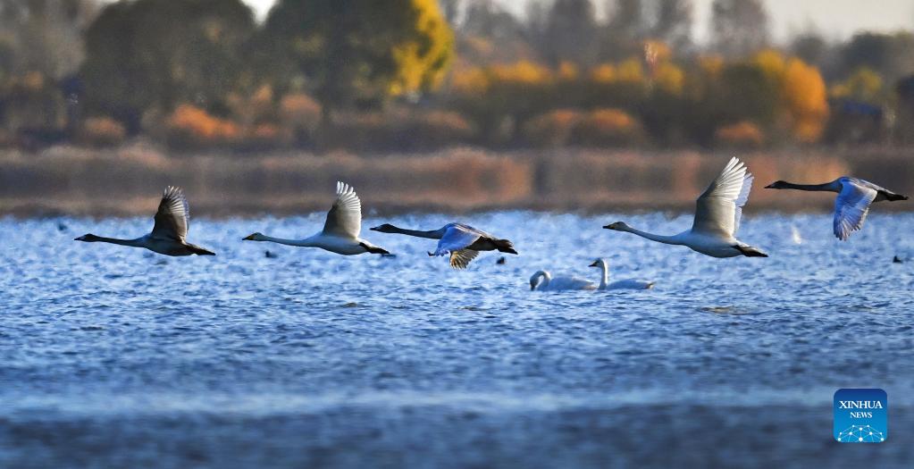 Swans are seen at the Hekou Reservoir wetland in Yulin, northwest China's Shaanxi Province, Oct. 31, 2021. To the south of the Maowusu Desert, the Yuyang District has witnessed improvement in eco-environment thanks to decades of afforestation efforts. (Xinhua/Tao Ming)