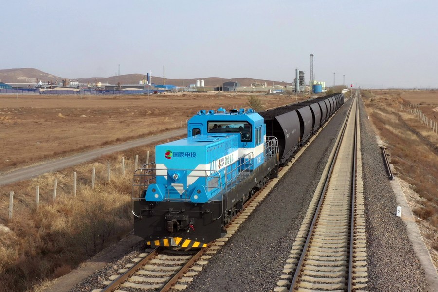 Photo taken on Oct. 29, 2021 shows the first China-developed hydrogen fuel cell hybrid locomotive in a trial run in north China's Inner Mongolia Autonomous Region. (Xinhua)