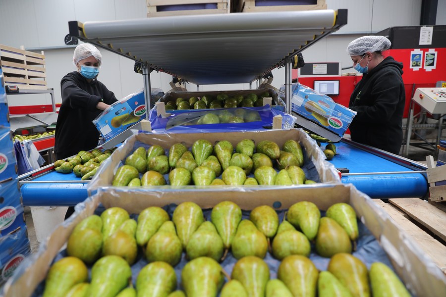 Belgian conference pears to be exported to China are seen at a facility of BFV (Belgian Fruit Valley) in Vrasene, Belgium, Oct. 22, 2021. (Xinhua/Zheng Huansong)