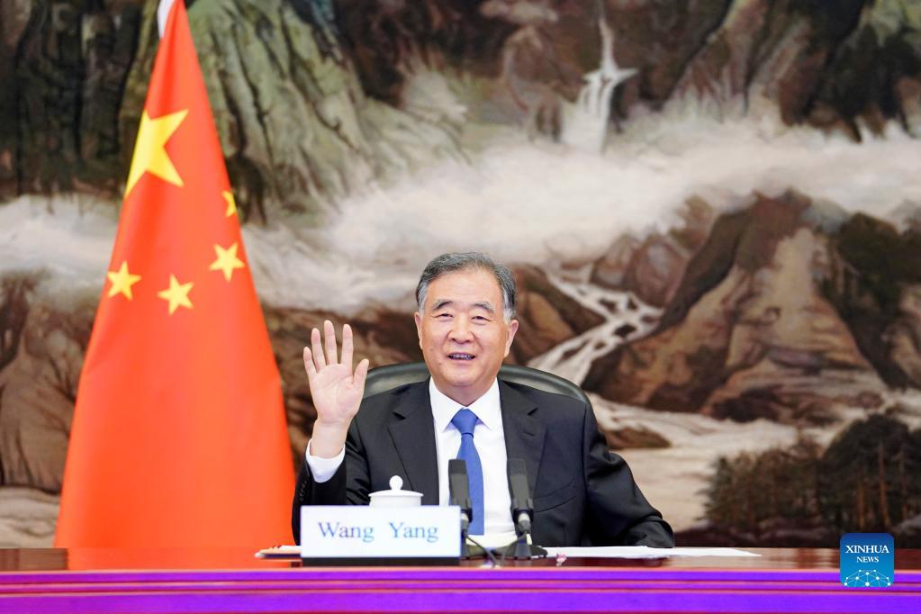 Wang Yang, chairman of the Chinese People's Political Consultative Conference National Committee, meets with Pornpetch Wichitcholchai, Thai deputy parliament president and Senate speaker, via video link in Beijing, capital of China, Nov. 1, 2021. (Xinhua/Yin Bogu)