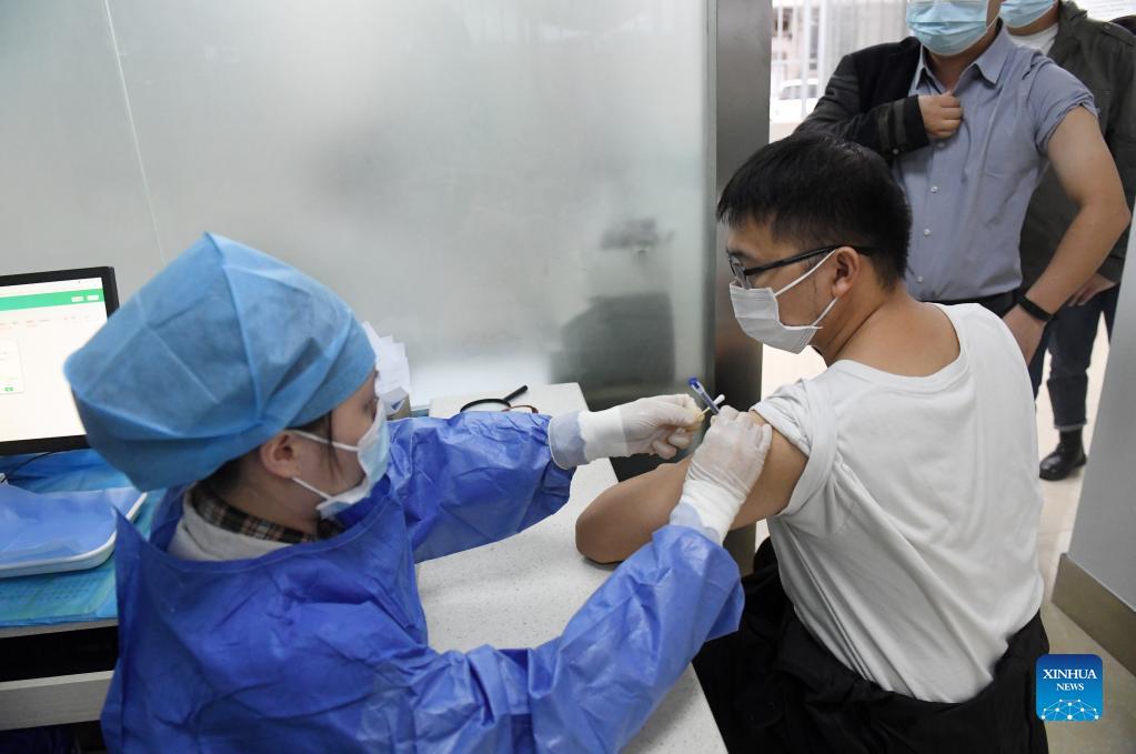 A resident gets a booster shot of the COVID-19 vaccine at a community medical service center in Qingxiu District of Nanning, south China's Guangxi Zhuang Autonomous Region, Nov. 2, 2021. (Xinhua/Lu Boan)