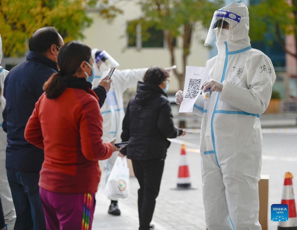 Residents scan a QR code to have their personal information registered at a COVID-19 testing site in Chengxi District of Xining, northwest China's Qinghai Province, Nov. 2, 2021. Xining has set up 121 testing sites in Chengxi District for massive COVID-19 nucleic acid testing. (Xinhua/Zhang Manyi)