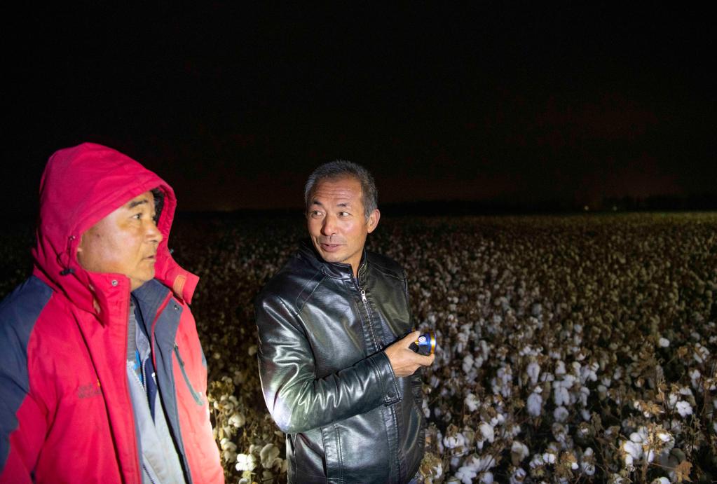 Lu Gaolin (R) talks with a cotton picker owner about harvesting progress in Shawan City, northwest China's Xinjiang Uygur Autonomous Region, Oct. 22, 2021. Lu Gaolin, a cotton farmer, is 56 years old and lives in Shawan City of Xinjiang Uygur Autonomous Region. The cotton harvest season in Xinjiang, China's largest cotton-producing region, will last until mid-November this year, with the output expected to reach 5.2 million tonnes. The region has contributed nearly 90 percent of China's cotton production capacity and about 20 percent of the global cotton production. In four days, Lu Gaolin completely finished harvesting his 64-hectare cotton field thanks to a gigantic green machine. The cotton picker is way more efficient than manual labor. "It used to take seven or eight workers over two months to complete the job of manually picking cotton," he said. Furthermore, new methods such as machine seeding and drone spraying have greatly improved farm work efficiency and quality. After this picking season, Lu and his son Dewen have bigger plans for the coming year. They intend to purchase a new cotton picker worth about 940,000 U.S. dollars together with other cotton farmers in order to increase their income. (Xinhua/Hu Huhu)