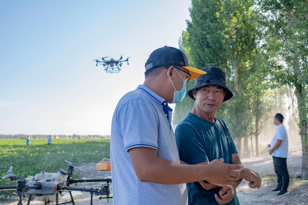 Lu Gaolin (R) talks with Wang Fuguang, head of an agricultural services team, about unmanned aerial vehicle in Shawan City, northwest China's Xinjiang Uygur Autonomous Region, July 15, 2021. Lu Gaolin, a cotton farmer, is 56 years old and lives in Shawan City of Xinjiang Uygur Autonomous Region. The cotton harvest season in Xinjiang, China's largest cotton-producing region, will last until mid-November this year, with the output expected to reach 5.2 million tonnes. The region has contributed nearly 90 percent of China's cotton production capacity and about 20 percent of the global cotton production. In four days, Lu Gaolin completely finished harvesting his 64-hectare cotton field thanks to a gigantic green machine. The cotton picker is way more efficient than manual labor. "It used to take seven or eight workers over two months to complete the job of manually picking cotton," he said. Furthermore, new methods such as machine seeding and drone spraying have greatly improved farm work efficiency and quality. After this picking season, Lu and his son Dewen have bigger plans for the coming year. They intend to purchase a new cotton picker worth about 940,000 U.S. dollars together with other cotton farmers in order to increase their income. (Xinhua/Hu Huhu)