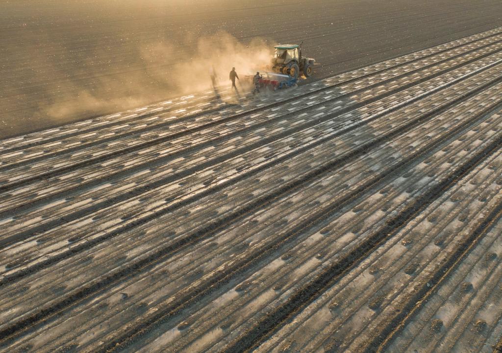 Aerial photo taken on April 15, 2021 shows Lu Gaolin, Lu Dewen and workers sowing a cotton field in Shawan City, northwest China's Xinjiang Uygur Autonomous Region. Lu Gaolin, a cotton farmer, is 56 years old and lives in Shawan City of Xinjiang Uygur Autonomous Region. The cotton harvest season in Xinjiang, China's largest cotton-producing region, will last until mid-November this year, with the output expected to reach 5.2 million tonnes. The region has contributed nearly 90 percent of China's cotton production capacity and about 20 percent of the global cotton production. In four days, Lu Gaolin completely finished harvesting his 64-hectare cotton field thanks to a gigantic green machine. The cotton picker is way more efficient than manual labor. "It used to take seven or eight workers over two months to complete the job of manually picking cotton," he said. Furthermore, new methods such as machine seeding and drone spraying have greatly improved farm work efficiency and quality. After this picking season, Lu and his son Dewen have bigger plans for the coming year. They intend to purchase a new cotton picker worth about 940,000 U.S. dollars together with other cotton farmers in order to increase their income. (Xinhua/Hu Huhu)