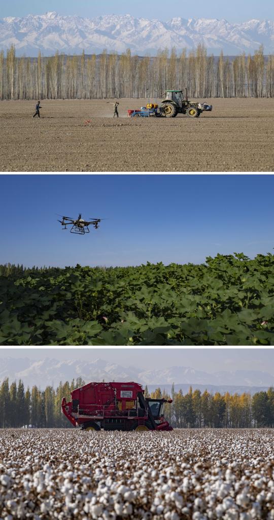 Combo photo shows Lu Gaolin, Lu Dewen and workers sowing a cotton field on April 15, 2021 (top), an unmanned aerial vehicle (UAV) spraying farming chemicals over cotton fields on July 15, 2021 (middle), and a cotton picker harvesting cotton on Oct. 24, 2021, in Shawan City, northwest China's Xinjiang Uygur Autonomous Region. Lu Gaolin, a cotton farmer, is 56 years old and lives in Shawan City of Xinjiang Uygur Autonomous Region. The cotton harvest season in Xinjiang, China's largest cotton-producing region, will last until mid-November this year, with the output expected to reach 5.2 million tonnes. The region has contributed nearly 90 percent of China's cotton production capacity and about 20 percent of the global cotton production. In four days, Lu Gaolin completely finished harvesting his 64-hectare cotton field thanks to a gigantic green machine. The cotton picker is way more efficient than manual labor. "It used to take seven or eight workers over two months to complete the job of manually picking cotton," he said. Furthermore, new methods such as machine seeding and drone spraying have greatly improved farm work efficiency and quality. After this picking season, Lu and his son Dewen have bigger plans for the coming year. They intend to purchase a new cotton picker worth about 940,000 U.S. dollars together with other cotton farmers in order to increase their income. (Xinhua/Hu Huhu)