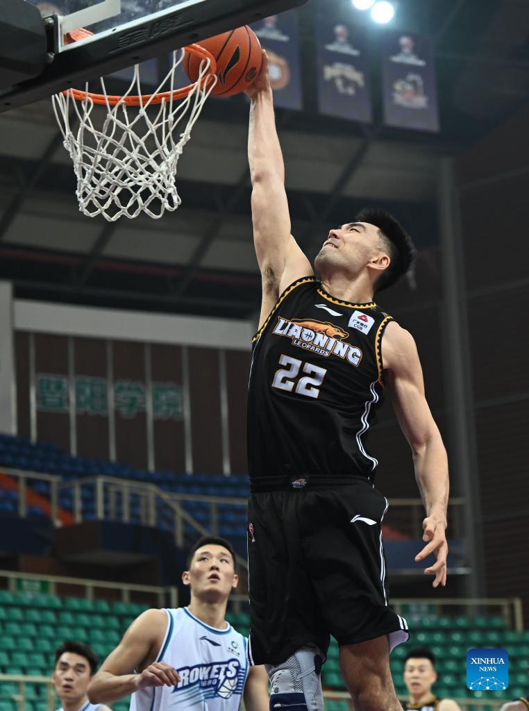 Li Xiaoxu (top) of Liaoning Flying Leopards dunks during the 8th round match between Liaoning Flying Leopards and Ningbo Rockets at the 2021-2022 season of the Chinese Basketball Association (CBA) league in Zhuji, east China's Zhejiang Province, Nov. 2, 2021. (Xinhua/Chen Xinbo)
