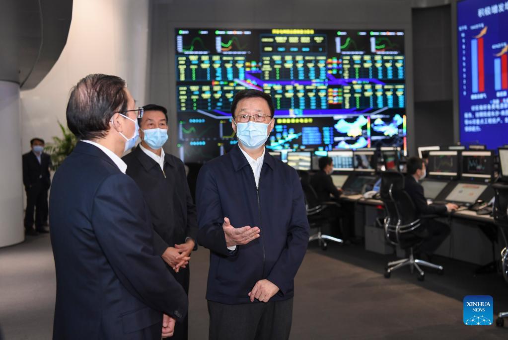 Chinese Vice Premier Han Zheng, also a member of the Standing Committee of the Political Bureau of the Communist Party of China Central Committee, visits the National Electric Power Dispatching and Control Center before a symposium at the State Grid Corporation of China, Nov. 2, 2021. Han made an inspection trip to the State Grid Corporation of China and chaired a symposium on Tuesday. (Xinhua/Yin Bogu)