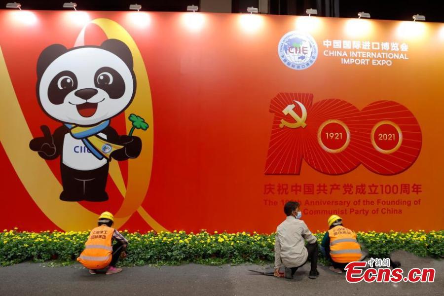 Staff members are busy making preparation work for the CIIE in Shanghai, Nov.2, 2021. (Photo: China News Service/Yin Liqin)