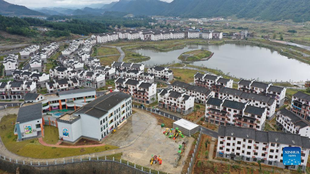 Aerial photo taken on Nov. 2, 2021 shows Xuehuahu relocation community of Zhonghe Township in Sandu Shui Autonomous County, southwest China's Guizhou Province. Women in the community were trained as embroiderers of traditional horse tail embroidery to increase their income. (Xinhua/Yang Ying)