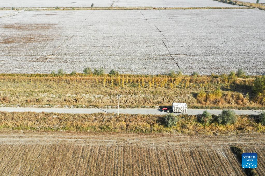 Aerial photo shows Erkin Rehim driving a tractor to transport his cotton in Yuli County, northwest China's Xinjiang Uygur Autonomous Region, Oct. 22, 2021. Erkin Rehimc began growing cotton in 2004 and has benefited from agricultural mechanization since 2017. The cotton farmer, 49, uses cotton pickers to harvest his 550 mu (about 90.6 acres) of cotton fields in 24 hours. (Xinhua/Zhao Ge)