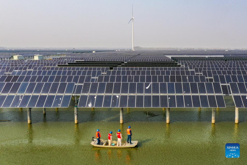 Aerial photo taken on Nov. 3, 2021 shows electricity workers patrolling amid a photovoltaic and wind power generation project installed above the fishery waters in Sheyanghu Township of Baoying County of Yangzhou, east China's Jiangsu Province. Baoying County of Yangzhou has been boosting green development by promoting solar and wind energy in recent years. The county's annual power generation from clean energy now reaches 2.1 billion kWh, accounting for 84 percent of the county's annual electricity consumption, equivalent to reducing coal consumption by 840,000 tonnes. (Xinhua/Li Bo)