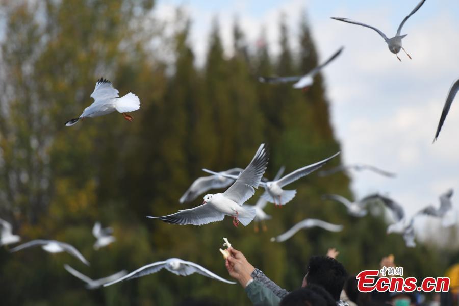 Tourists and citizens watch and feed the red-beaked gulls at Haigeng Dam in Kunming, southwest China's Yunnan Province, Nov.3, 2021. (Photo: China News Service/Liu Ranyang)