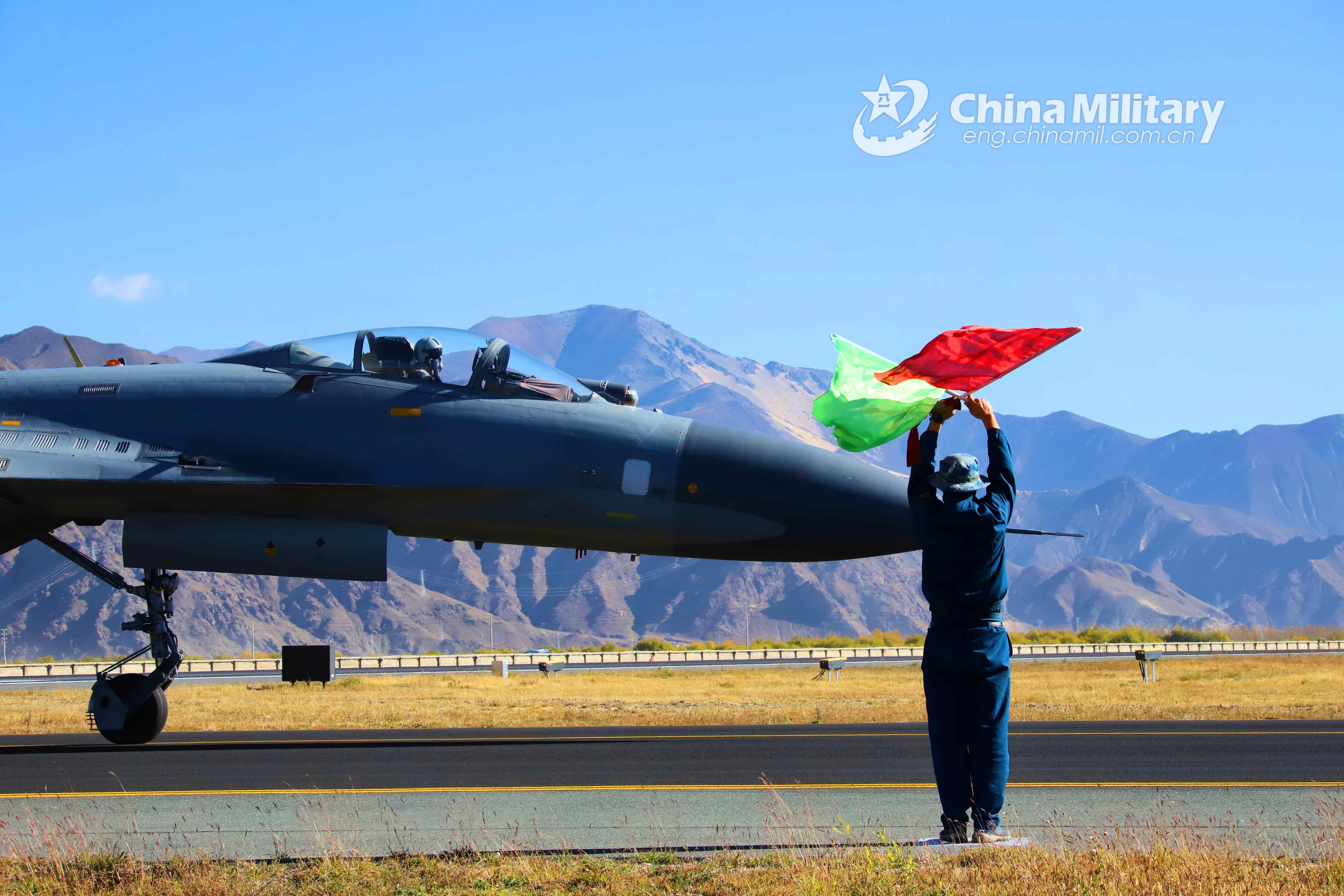 A ground crew member assigned to an aviation brigade of the air force under the PLA Western Theater Command uses flag signals to guide a fighter jet before its taking-off for flight training on October 26, 2021. (eng.chinamil.com.cn/Photo by Wen Rui)