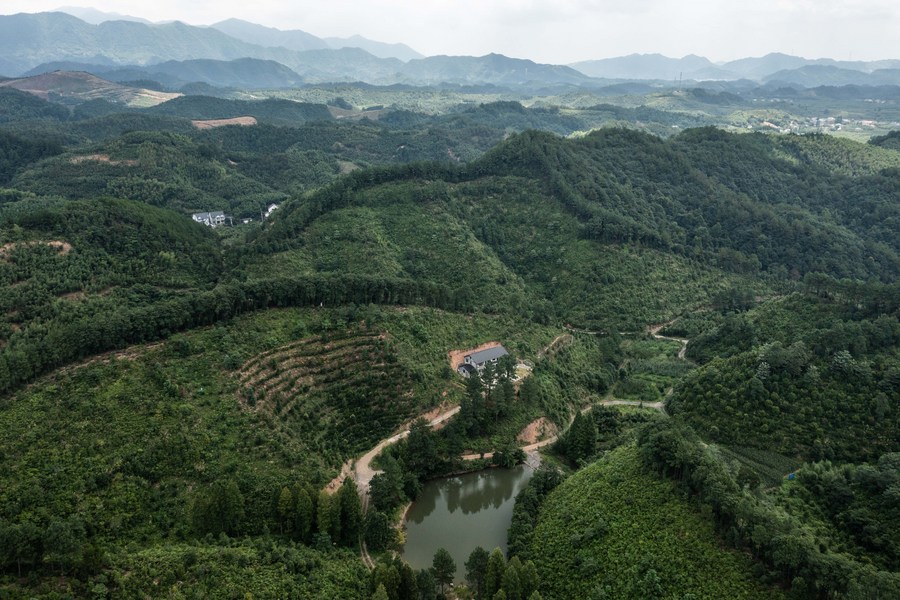 Aerial photo taken on July 20, 2021 shows a view of a forest area in Shangyang Village of Taihuyuan Township in Hangzhou, capital of east China's Zhejiang Province. (Xinhua/Xu Yu)