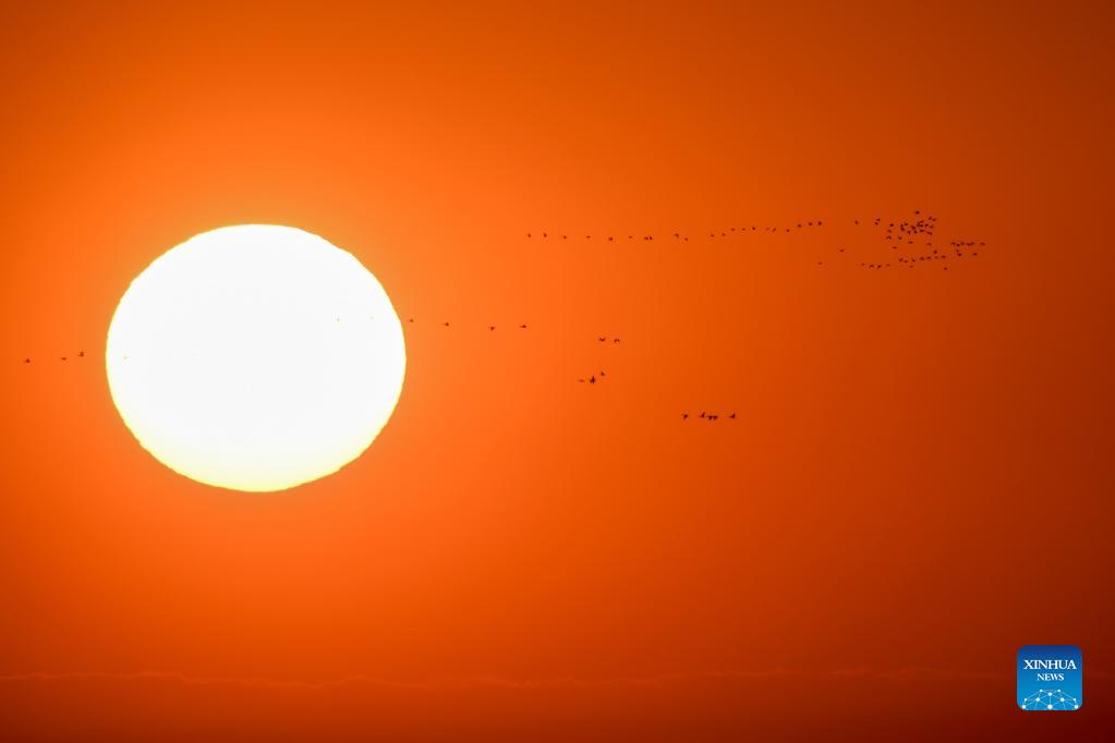 Migrant birds fly over Momoge National Nature Reserve in Zhenlai County, Baicheng City of northeast China's Jilin Province, Nov. 3, 2021. (Xinhua/Zhang Nan)