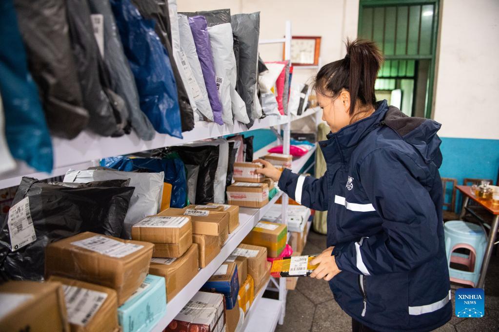 Hu Xia arranges packages in a rural delivery station in Huangshi Town in Leiyang, central China's Hunan Province, Nov. 3, 2021. Hu Xia is a post-90s deliverywoman providing delivery service for four villages in Huangshi Town. Over the past seven years, the number of local rural delivery orders has increased from less than 10 per day to more than 200 now. In addition to delivering packages, Hu also helps villagers sell bamboo shoots, eggs and other agricultural specialties through online store. Her delivery station has become one of the most lively places in village. In the January-August period, the delivery industry handled over 28 billion parcels in rural areas, a jump of more than 30 percent from a year earlier, according to the State Post Bureau. (Xinhua/Chen Sihan)