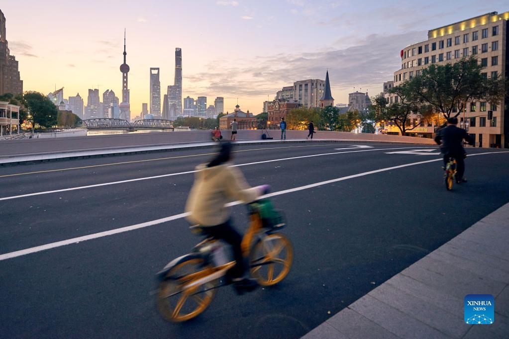 People ride bicycles on a street in east China's Shanghai, Nov. 4, 2021. The 4th China International Import Expo (CIIE) is scheduled for Shanghai from Nov. 5 to 10. (Photo by Zhuang Qi/Xinhua)