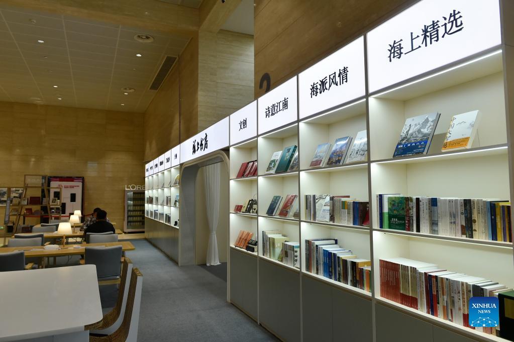 Photo taken on Nov. 4, 2021 shows a reading area at the media center of the 4th China International Import Expo (CIIE) at the National Exhibition and Convention Center (Shanghai) in Shanghai, east China. The 4th China International Import Expo (CIIE) is scheduled for Shanghai from Nov. 5 to 10. (Xinhua/Lu Peng)