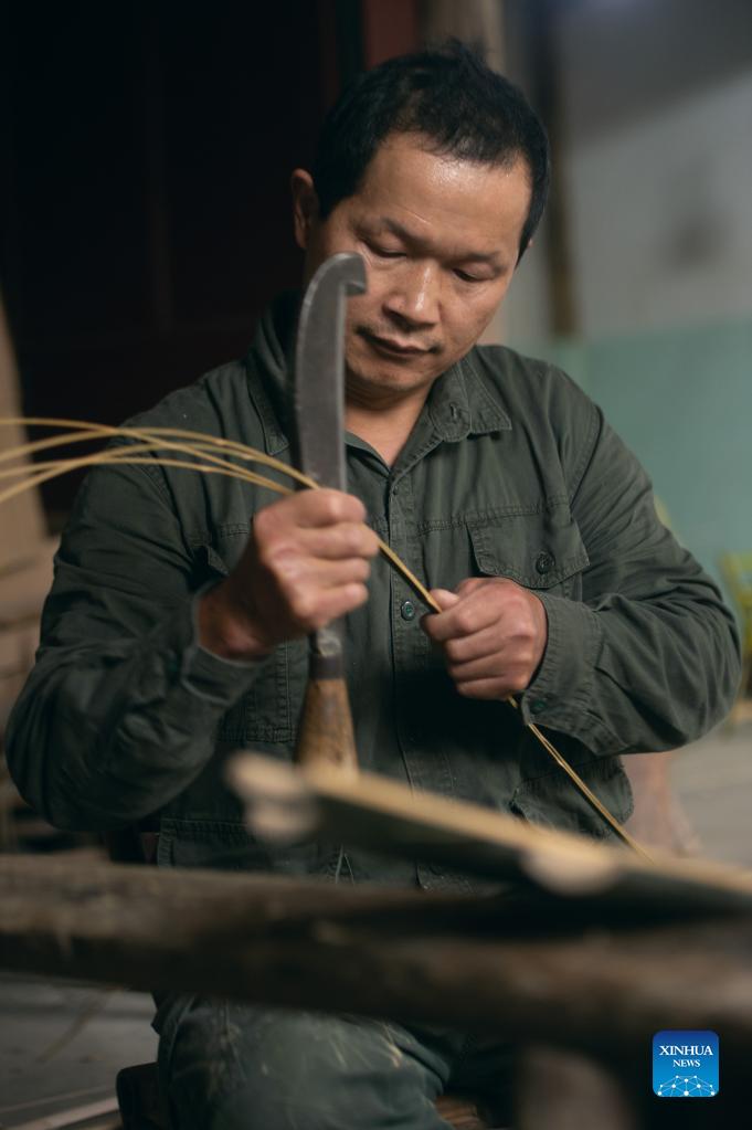 Pan Yunfeng processes bamboo strips for plaiting at Hengling Village in Lin'an District of Hangzhou, east China's Zhejiang Province, Nov. 2, 2021. A bamboo weaver in Hangzhou has amazed netizens after short videos of him turning thick bamboo into delicate slices were uploaded on social media platforms including TikTok. Pan Yunfeng, 51, makes pot brush, baskets, umbrellas and even bathtubs out of bamboo on TikTok. He started learning bamboo weaving at an early age and began to publish his works in 2019. With over 4.5 million followers on Douyin (the Chinese version of TikTok) and the most popular video garnering about 2 million likes, Pan has become a genuine influencer for netizens by promoting the traditional art simply using his own bare hands. Carrying a history of 2,000 years, bamboo weaving art was listed as a national intangible cultural heritage in 2008. "Bamboo weaving has become an integral part of my life. I will work my best to preserve and pass on the craft," Pan said. (Xinhua/Jiang Han)