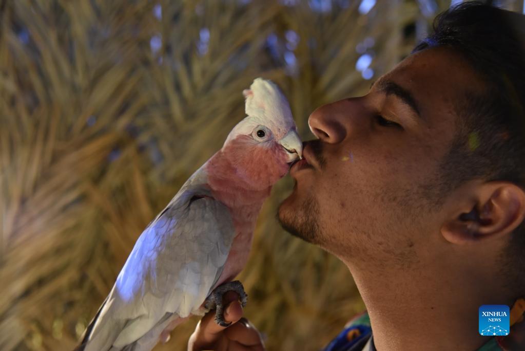 A man kisses a parrot during the Riyadh Safari in Riyadh, Saudi Arabia, Nov. 7, 2021. As part of Riyadh season 2021, the Riyadh Safari has opened to public, attracting thousands of people to spend their time with animals. (Xinhua/Wang Haizhou)