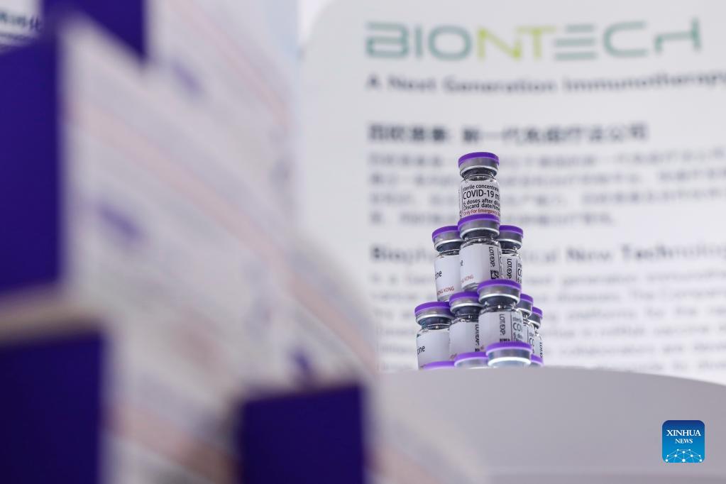 Vials of COVID-19 mRNA vaccine are seen at the booth of Fosun BioNTech at the Medical Equipment and Healthcare Products Exhibition Area of the 4th China International Import Expo (CIIE) in east China's Shanghai, Nov. 7, 2021. (Xinhua/Zhang Yuwei)