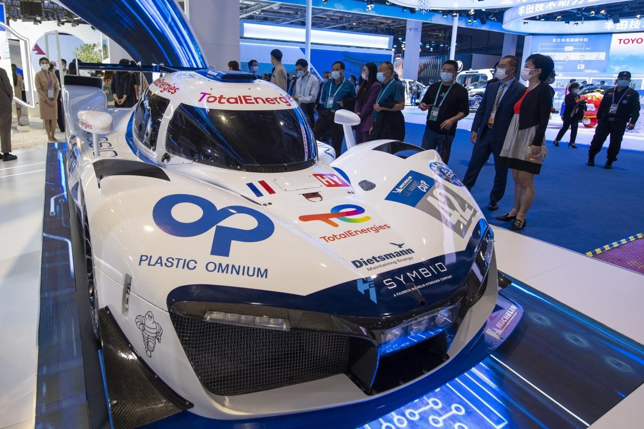 The world's first hydrogen-powered race car is exhibited at the 4th China International Import Expo (CIIE) on Nov. 5, 2021, the first day of the event. (People’s Daily Online/ Weng Qiyu)