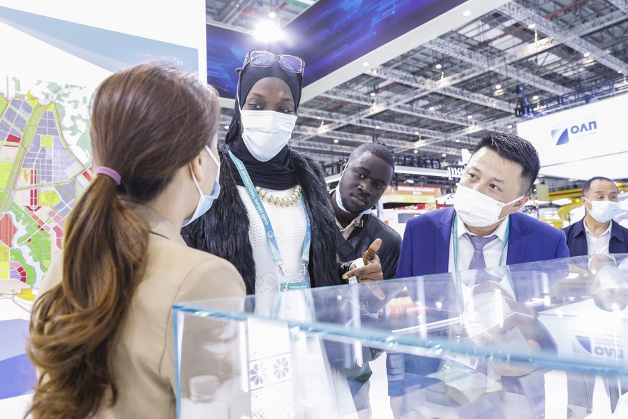 Visitors learn about products at the booth of China-Belarus Industrial Park at the Trade in Services Exhibition Area of the 4th China International Import Expo (CIIE) in east China's Shanghai, Nov. 7, 2021. (Xinhua/Zhang Yuwei)