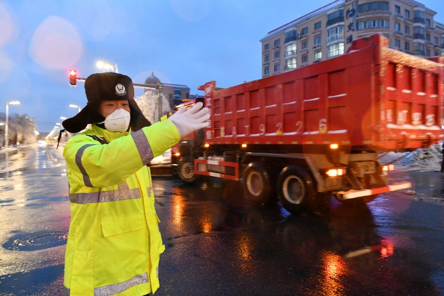 An auxiliary police officer directs traffic in freezing rain in Pingfang District, Harbin, northeast China's Heilongjiang Province, Nov. 8, 2021. (Xinhua/Wang Jianwei)
