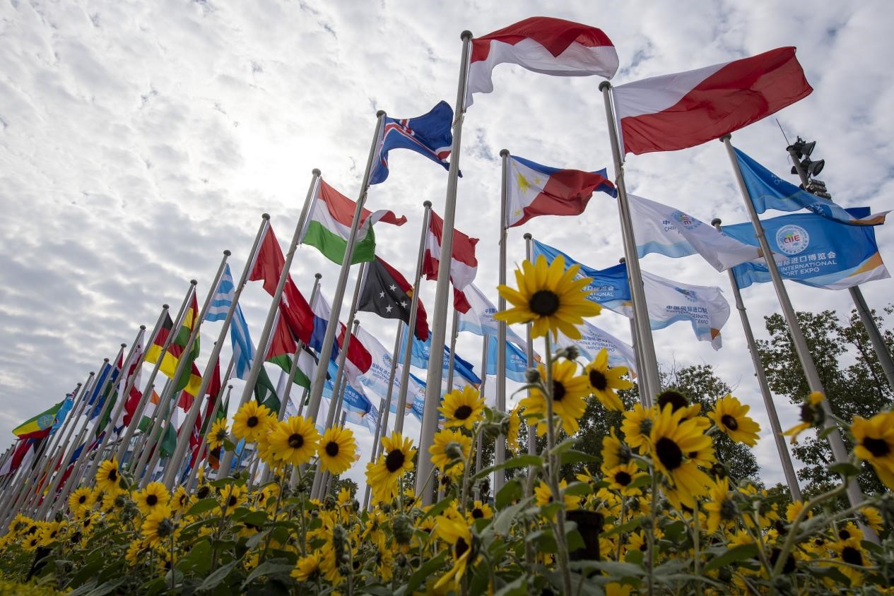 Photo taken on Nov. 4, 2021 shows blooming flowers and fluttering national flags of different countries at the south square of the National Exhibition and Convention Center (Shanghai), venue for the 4th China International Import Expo (CIIE). (People’s Daily Online/Weng Qiyu)