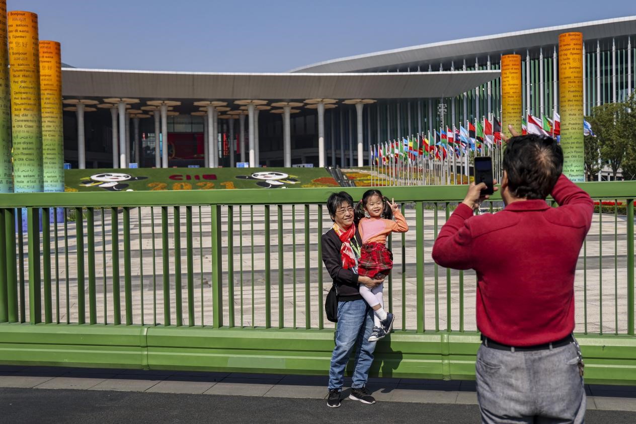 Citizens take photos in front of the National Exhibition and Convention Center (Shanghai), venue for the 4th China International Import Expo (CIIE), Oct. 30, 2021. (People’s Daily Online/Wang Chu)