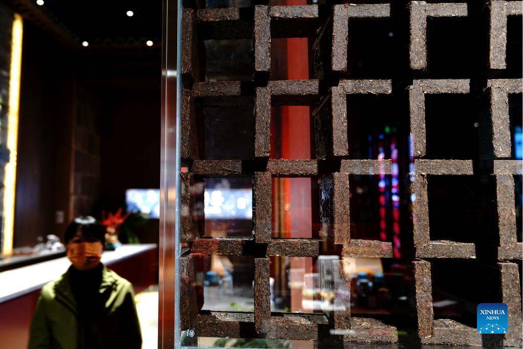 A visitor walks by tea bricks from central China's Hubei Province while visiting the China International Import Expo (CIIE) at the National Exhibition and Convention Center (Shanghai) in Shanghai, east China, Nov. 8, 2021. The ongoing 4th China International Import Expo (CIIE) is held in Shanghai from Nov. 5 to Nov. 10. (Xinhua/Zhang Jiansong)