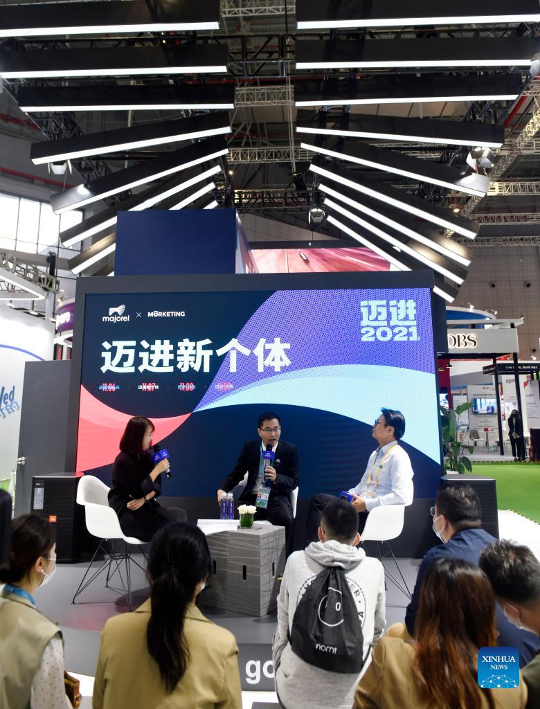 People take part in an event at the Majorel booth at the Trade in Services Exhibition Area of the 4th China International Import Expo (CIIE) in east China's Shanghai, Nov. 7, 2021. The 4th China International Import Expo (CIIE) has drawn over 300 businesses from over 50 countries and regions at its Trade in Services Exhibition Area. (Xinhua/Xu Liang)