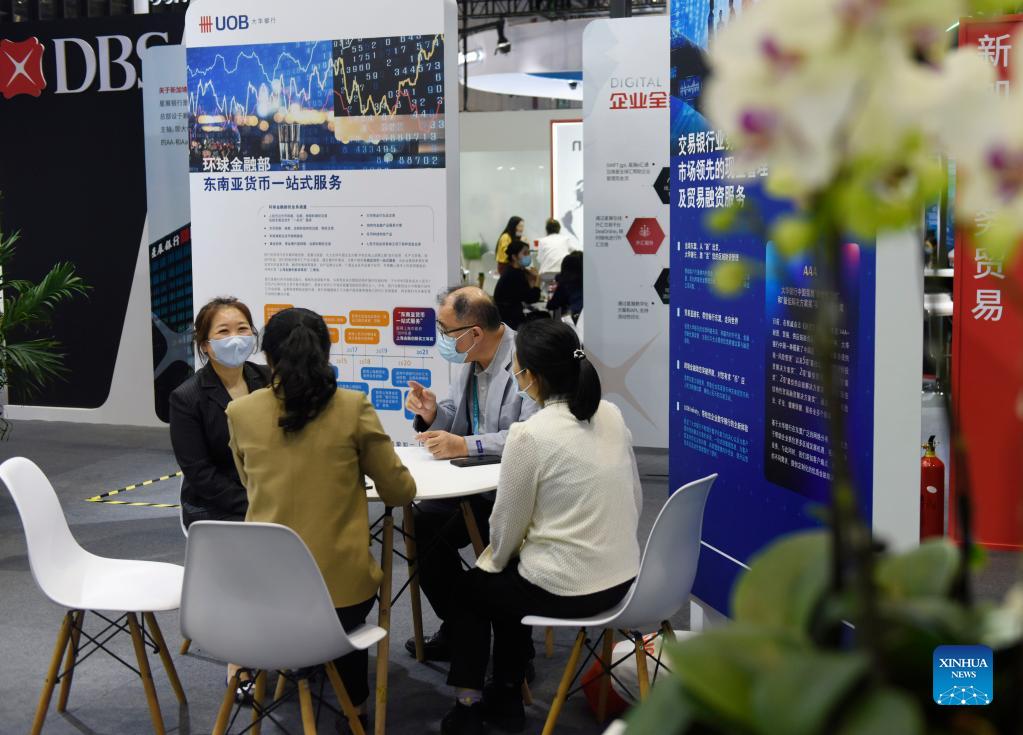 Visitors talk with exhibitors at the booth of the United Overseas Bank (UOB) at the Trade in Services Exhibition Area of the 4th China International Import Expo (CIIE) in east China's Shanghai, Nov. 7, 2021. The 4th China International Import Expo (CIIE) has drawn over 300 businesses from over 50 countries and regions at its Trade in Services Exhibition Area. (Xinhua/Xu Liang)