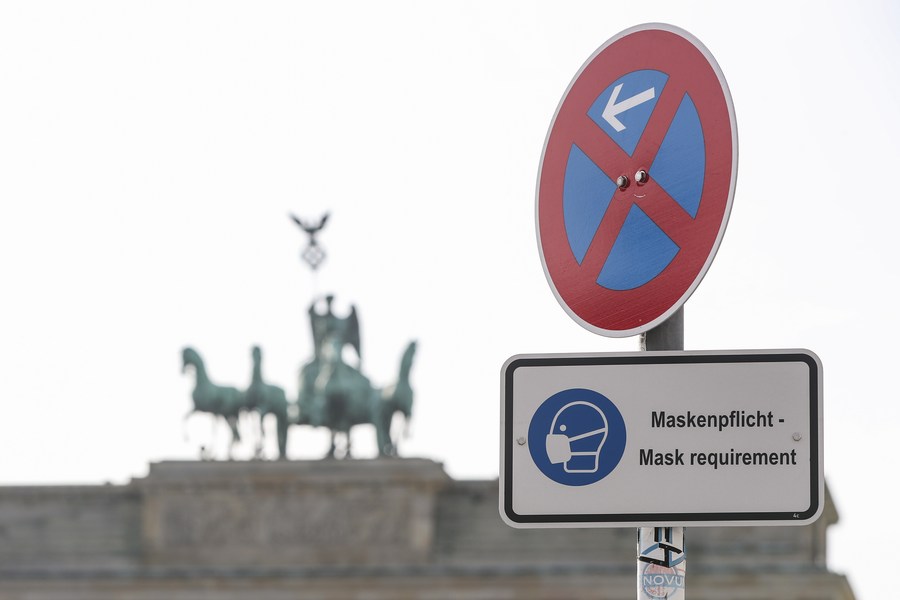 A sign of mask requirement is seen near the Brandenburg Gate in Berlin, Germany, March 3, 2021.(Xinhua/Shan Yuqi)