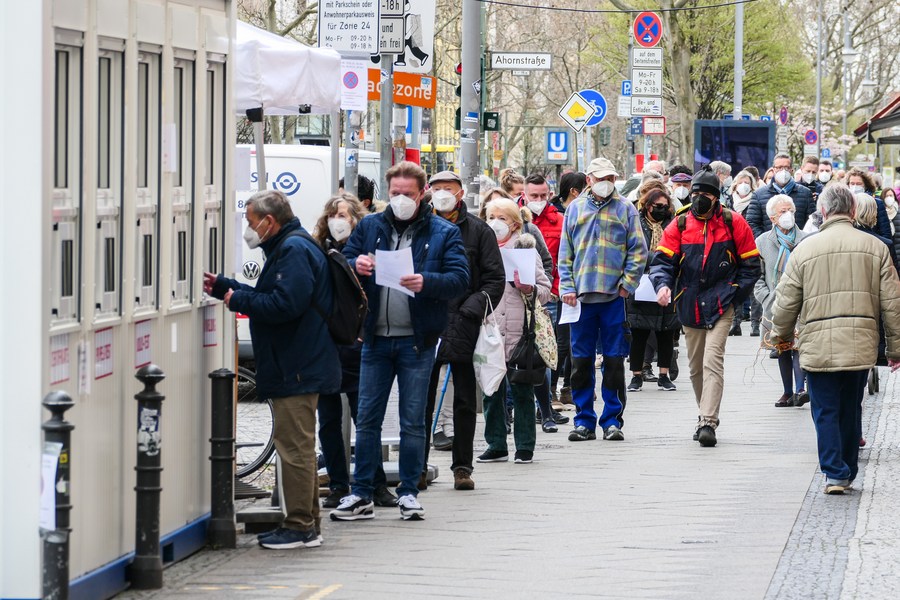 People wait for COVID-19 tests outside a test site in Berlin, capital of Germany, on April 12, 2021. (Xinhua/Stefan Zeitz)