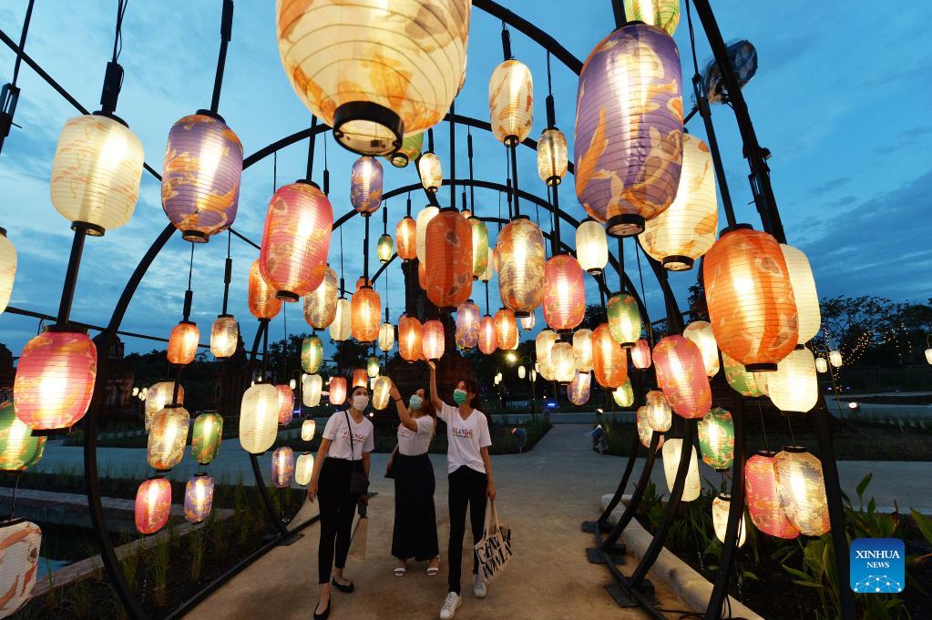 People visit a pre-show of the Thailand International Lantern and Food Festival at Muangboran, Samut Prakan Province, Thailand, on Nov. 8, 2021. The festival will be held from Nov. 12 to Dec. 6. (Xinhua/Rachen Sageamsak)