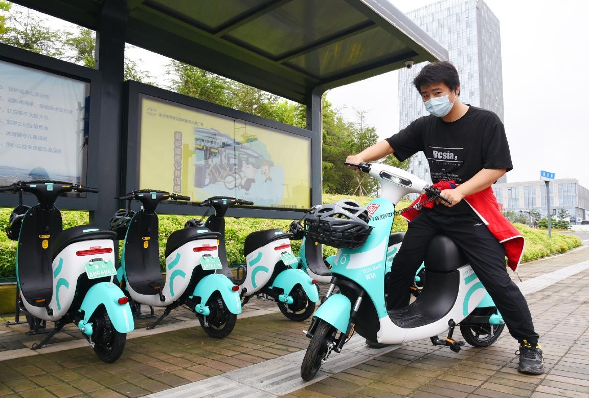 A citizen uses a shared electric scooter in Lianyungang Economic and Technological Development Area in Lianyungang city, east China’s Jiangsu province, Sept. 1, 2021. (People’s Daily Online/Geng Yuhe)