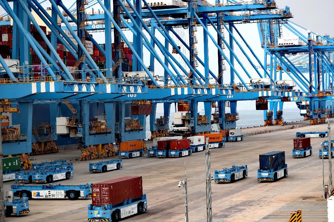 Photo taken on August 24, 2021 shows automated guided vehicles shuttling containers back and forth at a fully automated wharf at Qingdao Port in east China’s Shandong province. (People’s Daily Online/Zhang Jingang)