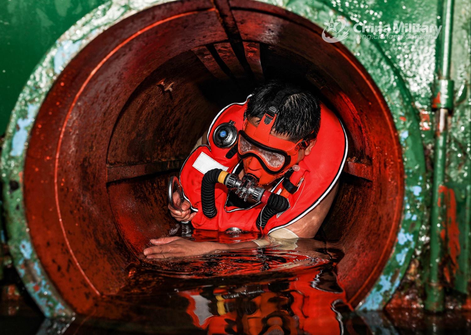 A sailor assigned to a naval base under the PLA Northern Theater Command crawls inside a torpedo tube during an evacuation drill in the training on danger prevention and lifesaving inside a submarine on October 11, 2021. (eng.chinamil.com.cn/Photo by Wang Qing)