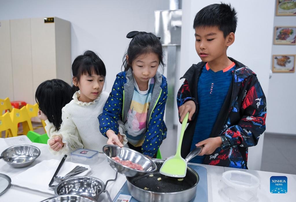 Pupils learn to cook at the Little Chef training center in Xishan Primary School in Shunde District of Foshan City, south China's Guangdong Province, Nov. 9, 2021. Xishan Primary School in Shunde has set up a Little Chef training center since September this year on its school campus in cooperation with Shunde Fengchu Vocational Skills Training School, providing students with a cooking class of 45 minutes after school every day. Professional cooking instructors, together with school teachers, give cooking lessons suitable for different ages at the training center. In the class, pupils can learn and practice the cooking of Chinese and Western cuisine, including making some easy-to-learn local Shunde specialties. Through the cooking course, pupils may learn about different food materials, understand how to prepare them, as well as build basic culinary skills and savor the dishes cooked by themselves. The course is open to students in all grades of school. There is one class provided each day and each class is attended by 60 students. The Little Chef cooking course has been well received by students and their parents since its launch. (Xinhua/Mao Siqian)