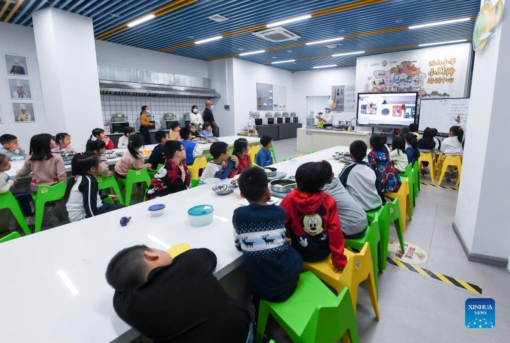 Pupils learn to cook at the Little Chef training center in Xishan Primary School in Shunde District of Foshan City, south China's Guangdong Province, Nov. 9, 2021. Xishan Primary School in Shunde has set up a Little Chef training center since September this year on its school campus in cooperation with Shunde Fengchu Vocational Skills Training School, providing students with a cooking class of 45 minutes after school every day. Professional cooking instructors, together with school teachers, give cooking lessons suitable for different ages at the training center. In the class, pupils can learn and practice the cooking of Chinese and Western cuisine, including making some easy-to-learn local Shunde specialties. Through the cooking course, pupils may learn about different food materials, understand how to prepare them, as well as build basic culinary skills and savor the dishes cooked by themselves. The course is open to students in all grades of school. There is one class provided each day and each class is attended by 60 students. The Little Chef cooking course has been well received by students and their parents since its launch. (Xinhua/Mao Siqian)