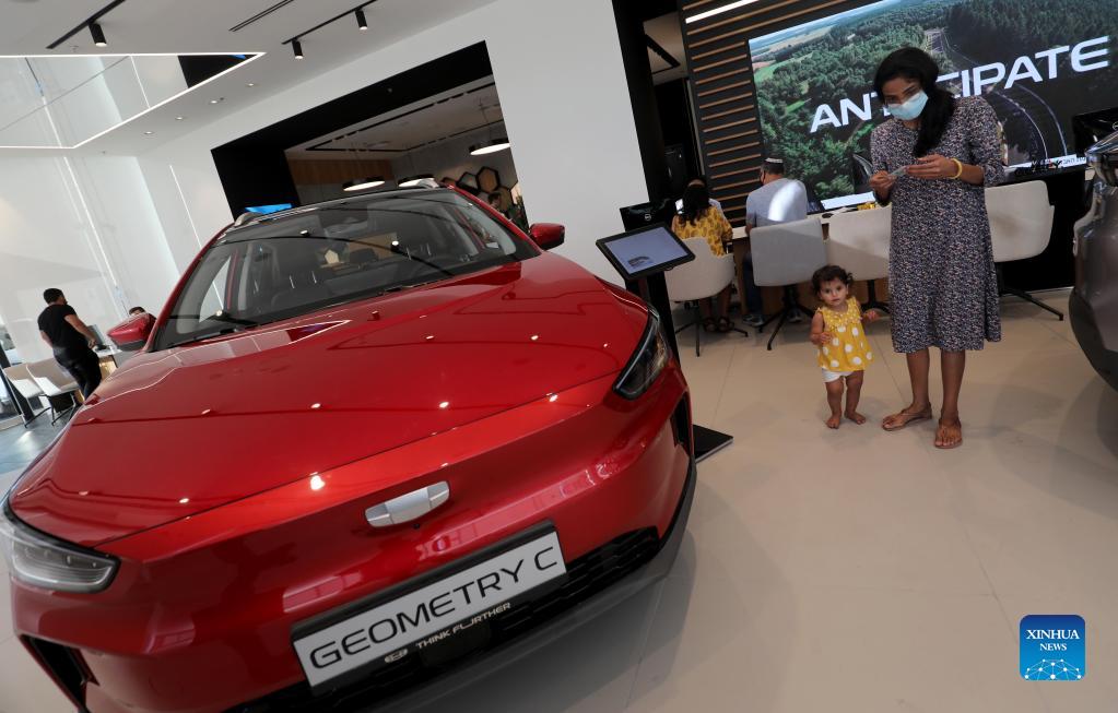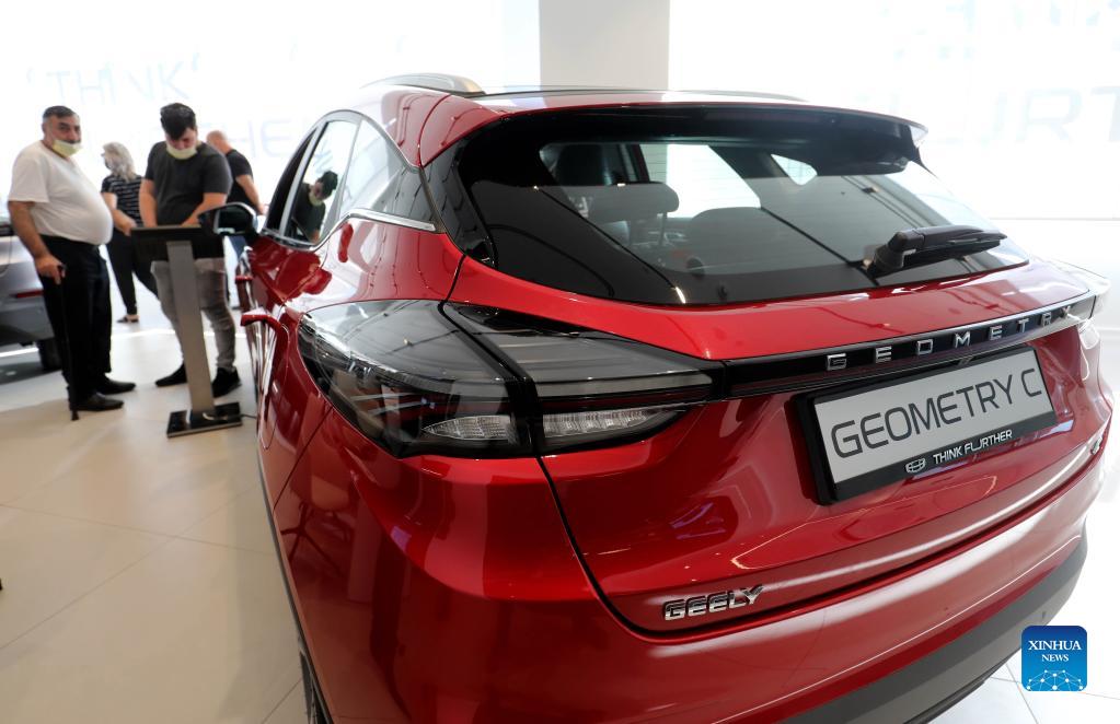 People visit a car company selling electric cars made by China's Geely Auto in Tel Aviv, Israel, on Nov. 10, 2021. Chinese automaker Geely Auto Group has started selling electric cars in Israel through the Israeli dealership Union Group. (Photo by Gil Cohen Magen/Xinhua)